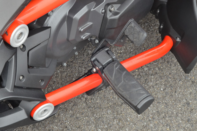 バイクと決定的に違うのは、ブレーキがフットペダルだけということ。右足でペダルを踏むと前後ブレーキが同時にかかるようになっている。ちなみにフロントキャリパーはブレンボ製。試乗前にクローズドエリアでフルブレーキングを試す機会があったのでガツンと踏んでみた。タイヤが“キュッ”と鳴って“ガンッ”と利く。その割に怖さがない。フロント2輪なので転倒する心配が少ないからだろう。