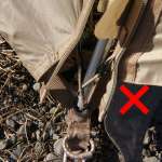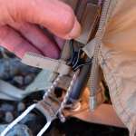 幕の四隅にはフックが付いています。これをフロアテープに取り付けるわけですが、ここでちょっぴり注意が必要です。フックが2つ、フレームにも伸縮性のない細いロープが2本付いていて、うっかりこのロープに取り付けたくなりますが、これは間違い。
