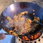 小ぶりな中華鍋なので腕に負担がかからず楽に扱えます。力の弱い人でも無理なく振れます。それに焚き火の熱が中華鍋の底に集中されるためでしょう、中華鍋のハンドルは短めですが、強火のわりに熱くありません。
