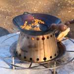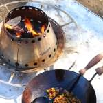 それに、ブースターを使うと薪がよく燃えて燃え残りが少ない! 調理後はブースターをはずして焚き火を楽しみ、焚き火終わりに向けて最後にブースターを載せて一気に燃やし尽くすなんて使い方も。それに分離型シングルバーナーに限りますが、バーナーヘッドだけをブースターの中に入れれば五徳兼風防となり、火力調節しながら炒飯を作れます。思った以上にお得なセットになっています。