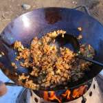 焚き火台にブースターを載せて炒飯を作ってみました。中華鍋は1〜1.5人分の炒飯作りにちょうどいいサイズ。2人分でもいけますが、豪快に中華鍋を振り、オタマをガシガシいわせるとご飯が飛び出しそうで気を使います。