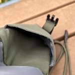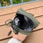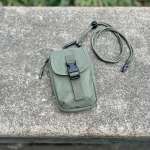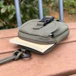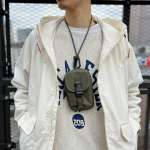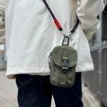 デザインは、前面ポケットにナイロンテープとバックルをあしらったのみ。至ってシンプルですが、オリーブグリーンのカラーと相まって、アウトドアギアっぽい雰囲気を纏っています。ちなみに、生地は撥水加工を施したリップストップ素材を使用しているので、実際にアウトドアシーンでも重宝するでしょう。