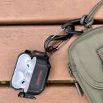 ポーチとコードの間にはカラビナを使用。ゆえに、カラビナ付きのAirPodsケースを活用すれば写真のようにセット可能です。あるいは、コードそれ自体をポーチから外し、リュックやベルトループへ装着しても便利そう!