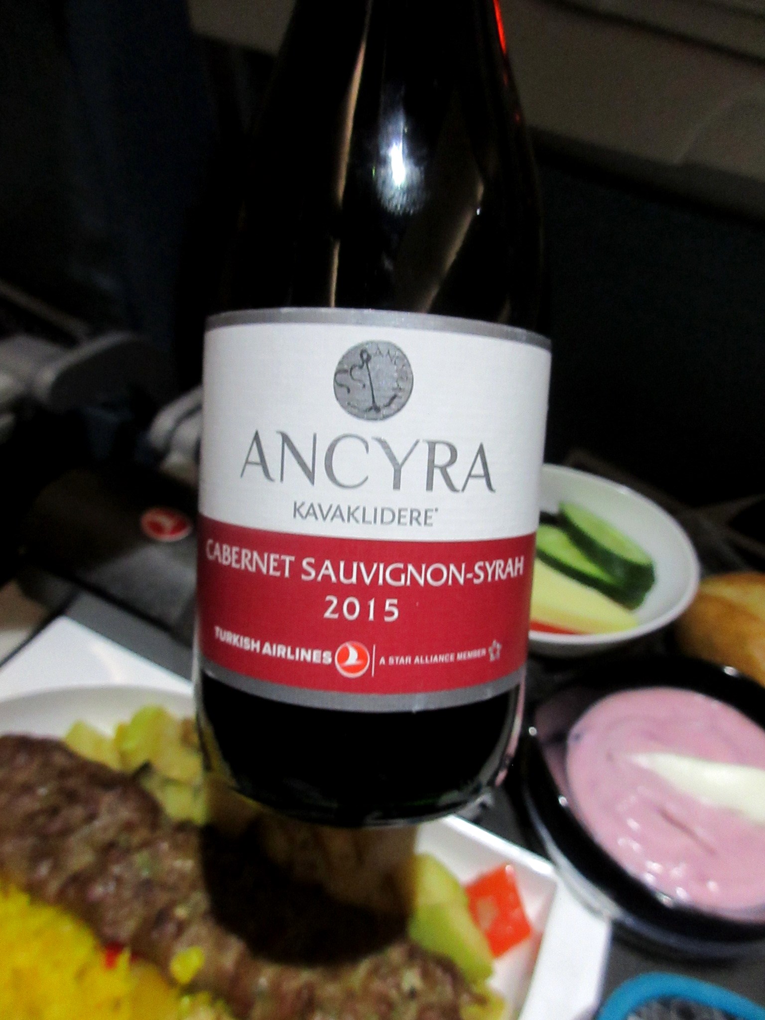 ということで、往きの便では飲めなかった赤ワインを合わせることにしました。フランス産とトルコ産があると言われましたが、もちろんトルコ産をチョイス。スクリューキャップのミニボトルでいただきます。