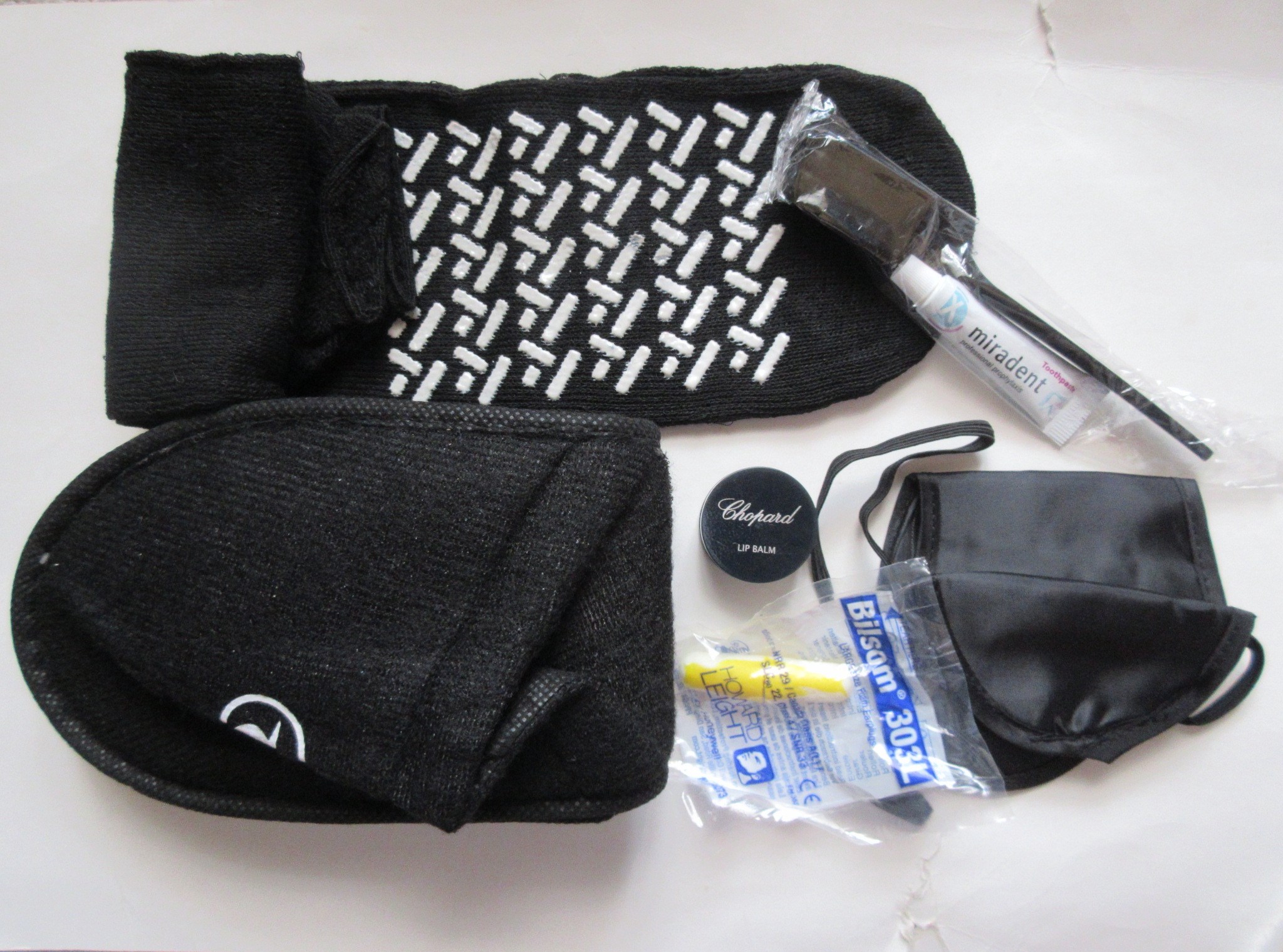 中身は、折り畳みスリッパ、長靴下、アイマスク、耳栓、歯磨きセット、リップバーム。