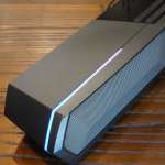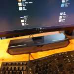 商品説明によると“スリム&ロープロファイルなボディ”(=コンパクトで背が低いということ)のサウンドバーで、サイズは約410x68x108mm。想定する使用環境はPCモニター下の隙間です。高さ約6.8cmはたしかに収まる高さだし、幅41cmはむしろ目一杯に幅を取ったイメージ。最大48Wの2.0スピーカーにパッシブラジエーター、バスレフポート搭載とサイズを活かした設計です。