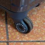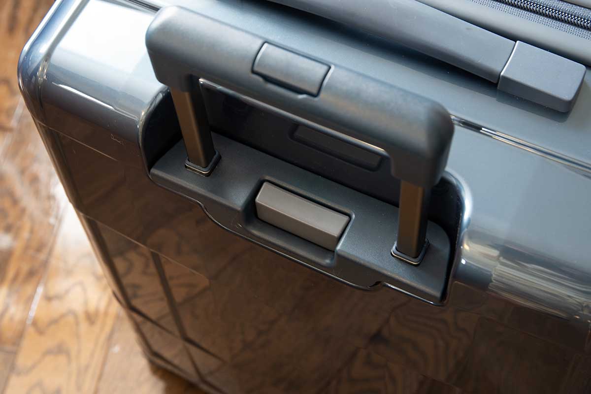 走行が滑らかだから、空港のロビーや電車の中でスススーッと転がっていきそうな時もありますが、そんな時でも問題ありません。手元にあるボタンをポチッと押すだけでキャスターストッパーがかかるので、不意に動き出すのを防いでくれます。