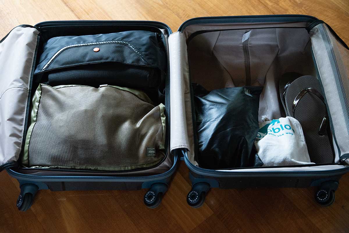 肝心の収納力はといえば、シンプルな内装で、本体内の隅々まで荷物を収納できるからきれいに収まります。今回は5泊だったのですが、レンズ2本を入れたカメラバッグと着替え、洗面道具を入れてまだ余るくらい(カメラ本体、PCは別途リュックに収納)。
