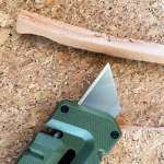 ボディ先端付近にかぎ状の凹みがあり、そこではブレードが露出しているので、パラコードや紐などをその凹みに引っ掛けて切ることができます。ブレードを出す必要がないので、安全で便利ですね。
