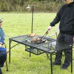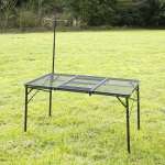 センターテーブルの脚を引き起こし、ひっくり返して吊り下げればこの通り。BBQグリルや焚き火台を載せられるラックになるんです。