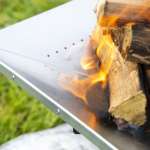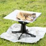 「焚き火ツリー」はスチール製の脚板2枚の上に、フラットなステンレス製本体を載せるだけ。組み立て簡単、省スペース収納の焚き火台です。