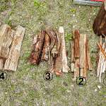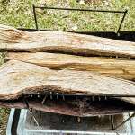まずは焚き火台の上に3番くらいの太さの薪で、皮でない方を上に向けて一番下に敷いてください。完全にフラットである必要はありませんが、なるべくフラットになるようにしましょう。