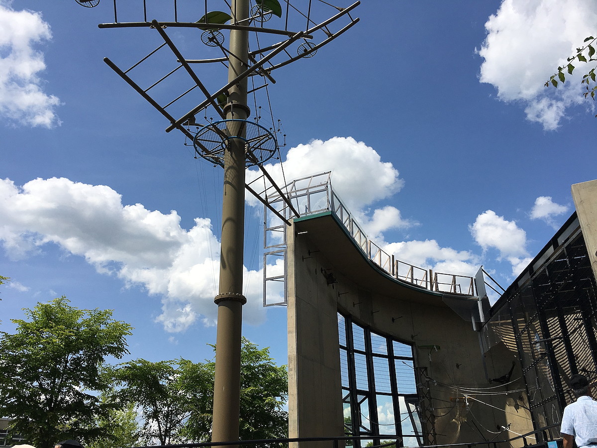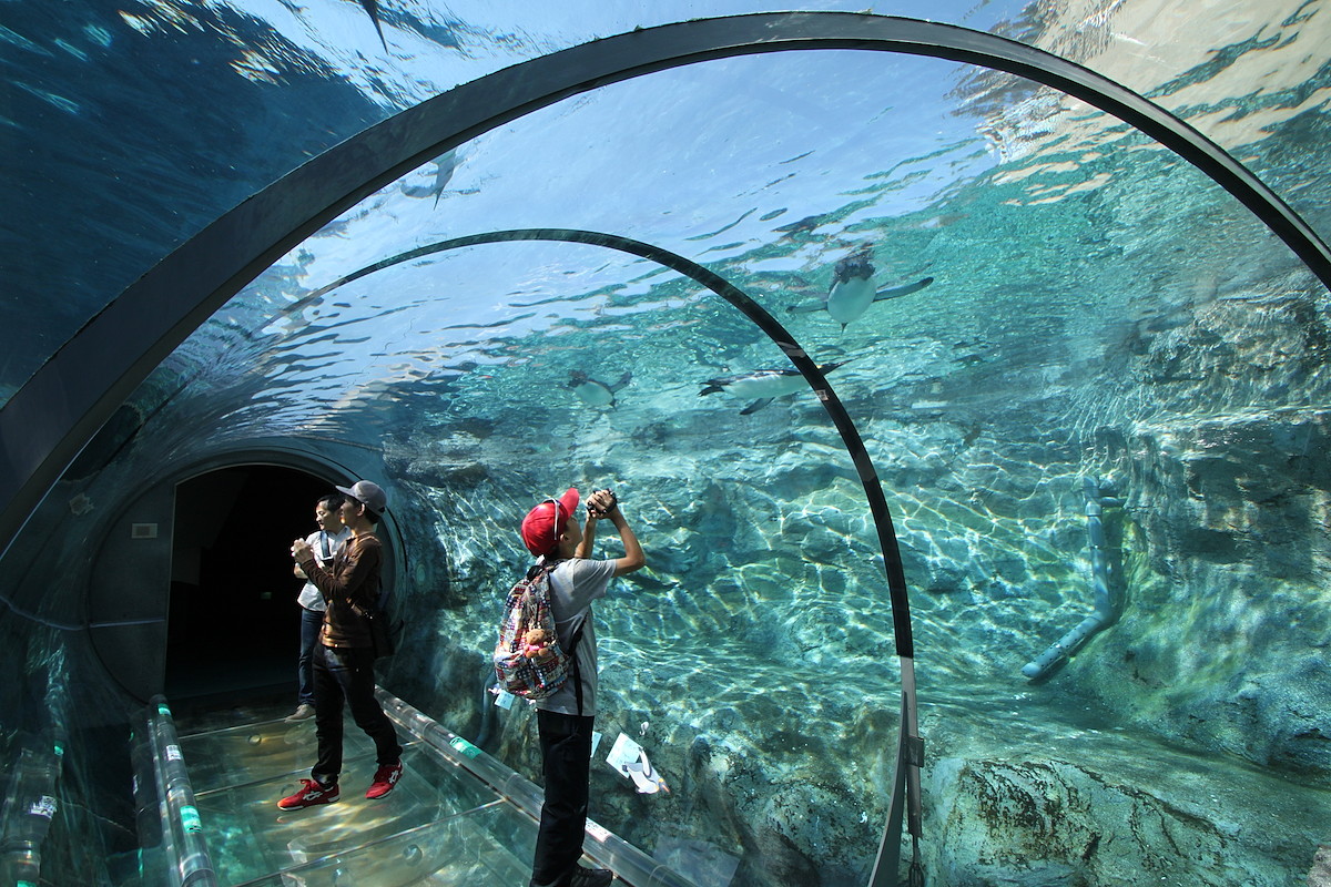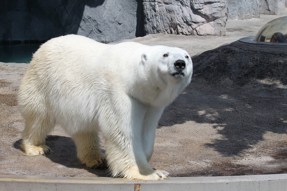 館内の大きなガラス張りの向こうは巨大プール。ここに飛び込んで泳ぐホッキョクグマを、ガラス越しに見られるのです。