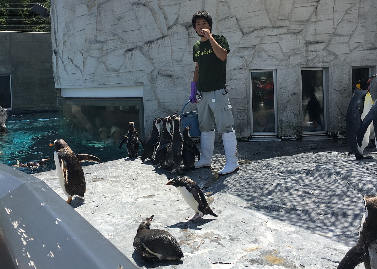 もぐもぐタイムの10分前くらいに入り口付近を見たら、既に長蛇の列。ここでは館内でもぐもぐタイムを見学するので、入場できる人数にある程度制限があるように思われます。週末に行くなら、なるべく早めに入館していい位置をキープすべきかと。