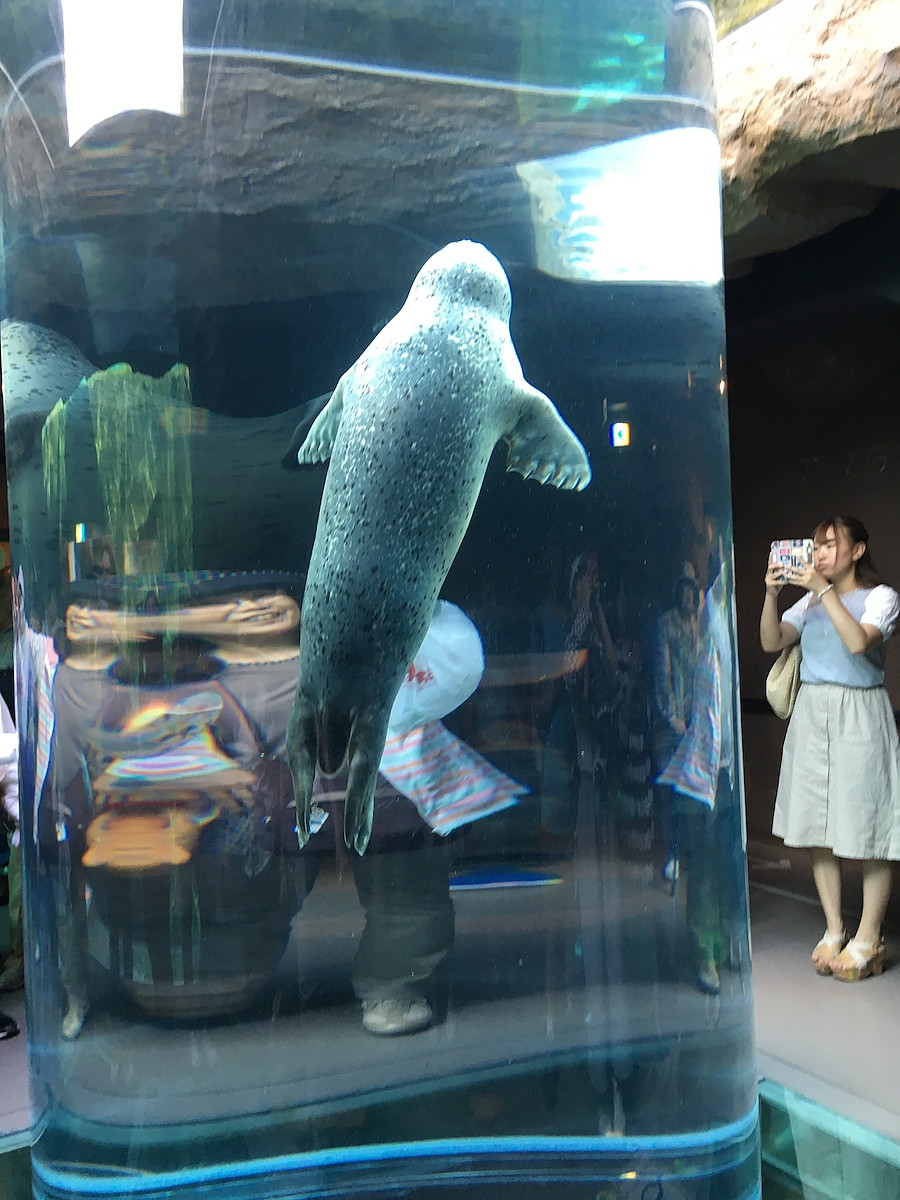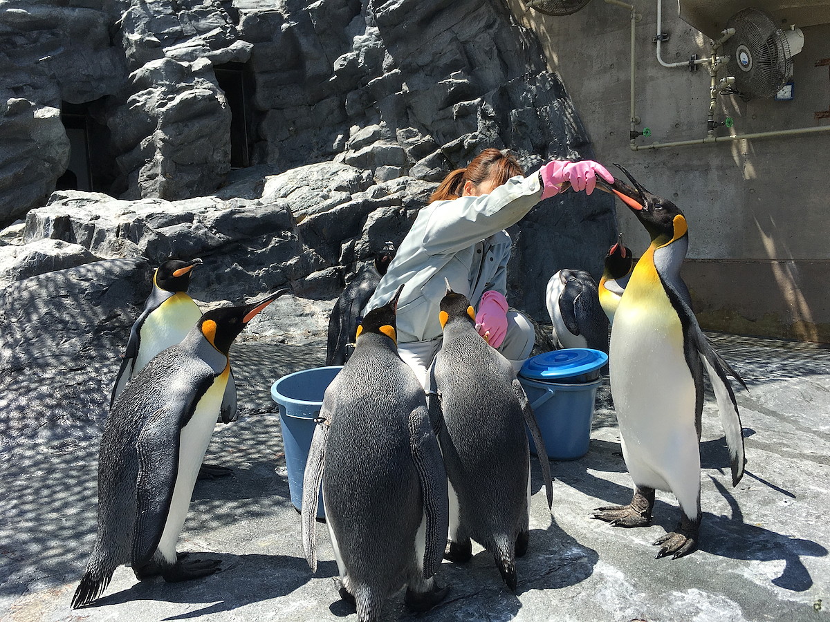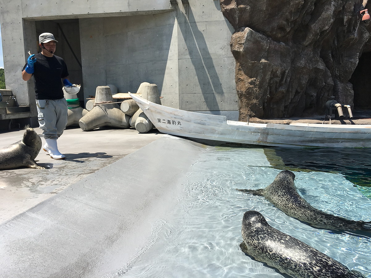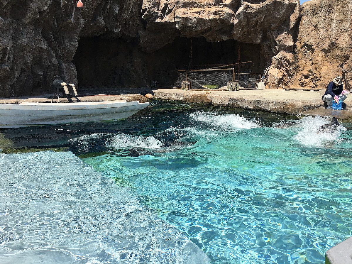 飼育員さんがエサの魚をプールに投げ入れると、追うように飛び込んでいきます。その水しぶきたるや凄まじい!
