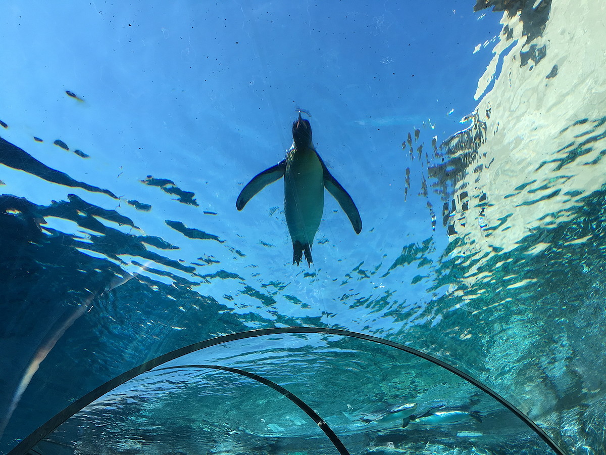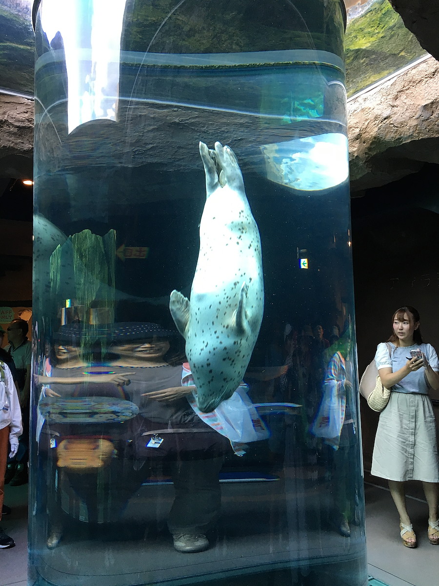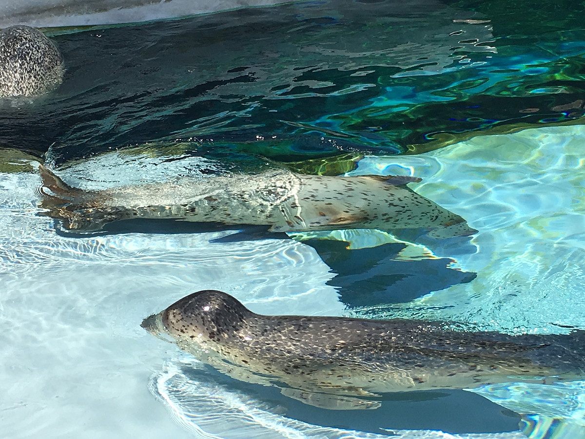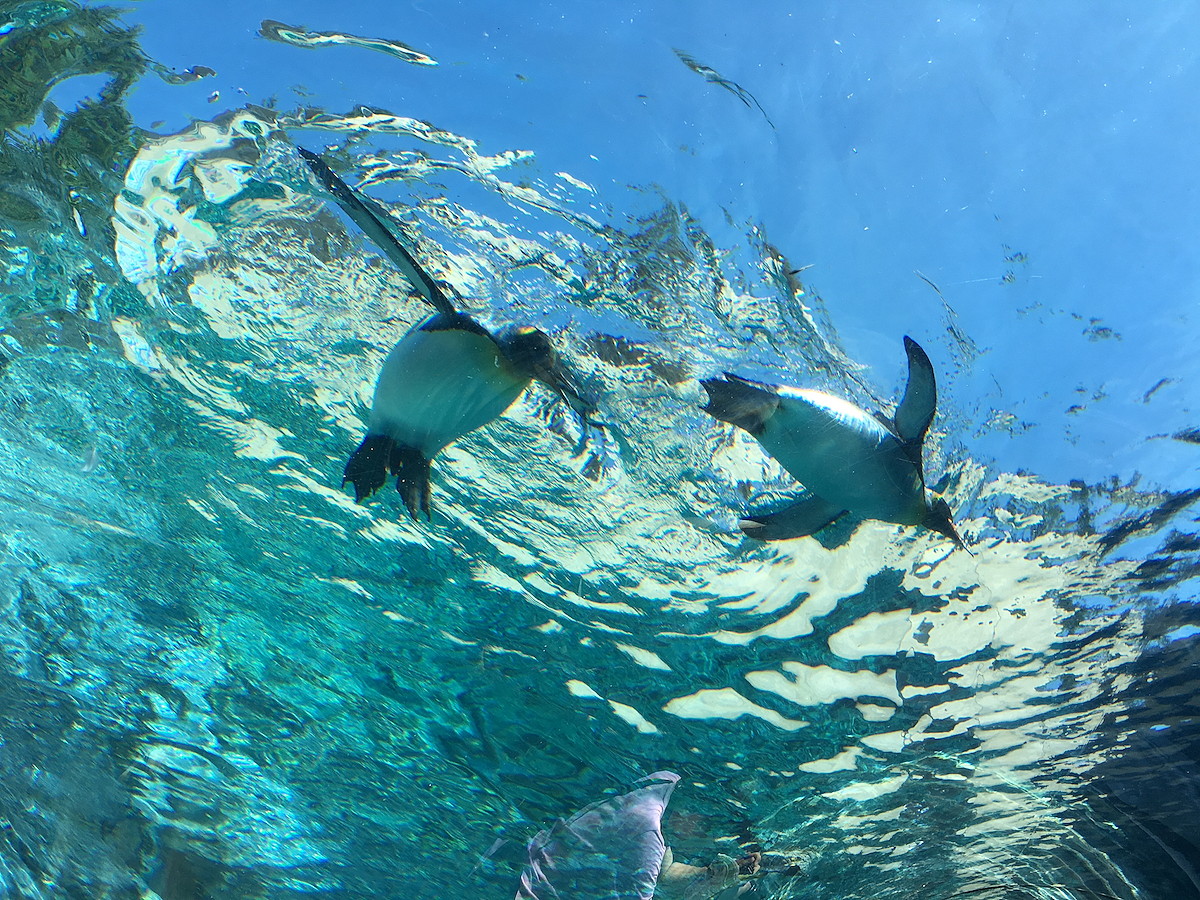 飼育員さんがエサの魚をプールに投げ入れると、追うように飛び込んでいきます。その水しぶきたるや凄まじい!