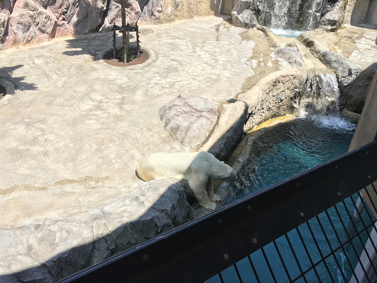 ホッキョクグマってものすごく大きいんですけど、その巨体が泳げるぐらいですから、相当広くて深いことがわかります。普段のホッキョクグマは放飼場でのんびり過ごすことが多いようですが、プールに入るのは基本的にもぐもぐタイムのときだけ。もぐもぐタイムがどれだけ貴重な時間かというのがお分かりいただけたでしょうか。