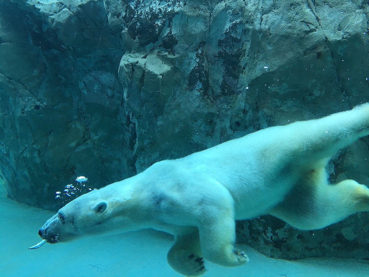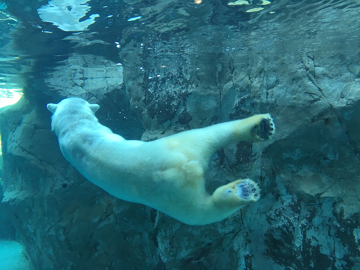 泳ぐホッキョクグマの水中の様子を見たことってありますか? ものすごく堂々として迫力があるんですよ。さらに、毛足の長い毛皮をフワフワさせながら浮いている様子は、本当にカワイイ! ひと目でファンになりました。