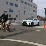 また、ITS対応無線機を搭載した自転車にも乗らせてもらい(実際にクルマは接近していないが、擬似的に信号が届く)、走行する速度が速くなると危険を知らせる通知が届くタイミングも早くなることが体験できました。