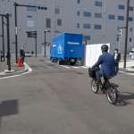 メディア向けに公開された実証実験のデモンストレーションでは、大型のトラックが止まっていて見通しの悪い交差点に自転車が差し掛かるシチュエーションが用意されていました。普段、街中で自転車に乗っていると、割とよくある状況です。クルマのほうは死角から接近してくるため、そのまま交差点に入れば衝突事故に発展してしまいます。