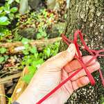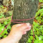 ▲交差させたロープは下を潜らせ、立木の奥へ引っ張る