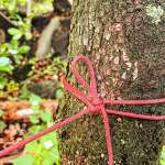 ▲輪っかの左側を引っ張りながら、結び目を立木方向へ押し込んでいくと形が決まり、ロープが締まります