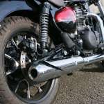 ホイール径は前後17インチと現代的なセレクト。スポーツタイヤも選びやすいサイズなので、よりハイグリップなタイヤを履かせることもできます。マフラーはややテールが持ち上がった形状となっていますが、これもバンク角を確保するためのデザイン。ホンダでいえば「GB350S」に近いキャラクターです。