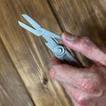 刃渡り25mmのミニハサミ。この手のマルチツールのハサミとしては標準的か少し大きいくらい。ハンドルから展開し、一度開ききってからツマミを戻すと使えます。基部のところに細いバネがあり、その力でハサミの開く力を補います。ユーザーはツマミの部分を親指で押すだけで切ることができます。