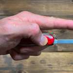 爪切りの反対側にはハサミが収納されていて、完全に展開すると自動的にハサミになります。板バネのリバウンドで自動的に開くので、写真のように親指で押すだけで切ることができます。
