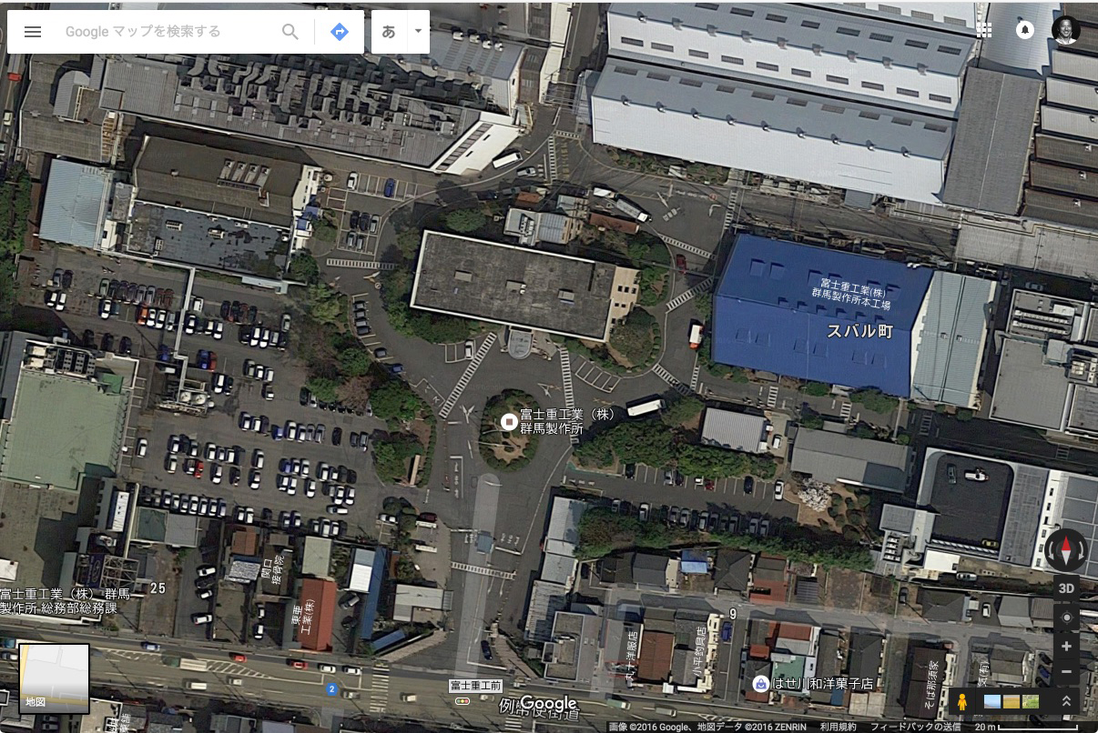 航空機メーカー時代から存在する本工場の本館は、上から見ると飛行機のカタチになっている!? どれどれとGoogle Mapで見てみると…。なるほど、本館の建物が飛行機のカタチをしているのではなく、ロータリーや他の建物を含めて、全体で飛行機のカタチを形成しているのですね。いかがです、分かりますか?