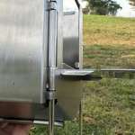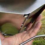「コンパクト ファイヤーピット」の、モンベルロゴが記された短辺2面には窓が付いています。この窓部分は2つツメがあり、それが引っかかっているだけ。真ん中の出っ張りを持ちあげると簡単に開きます。