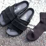 最近、街中で多く見かけるのが、ブラックのサンダルに黒ソックスを掛け合わせるスタイル。ひと目見ると「黒いシューズを履いているの?」と見えるのがポイント。