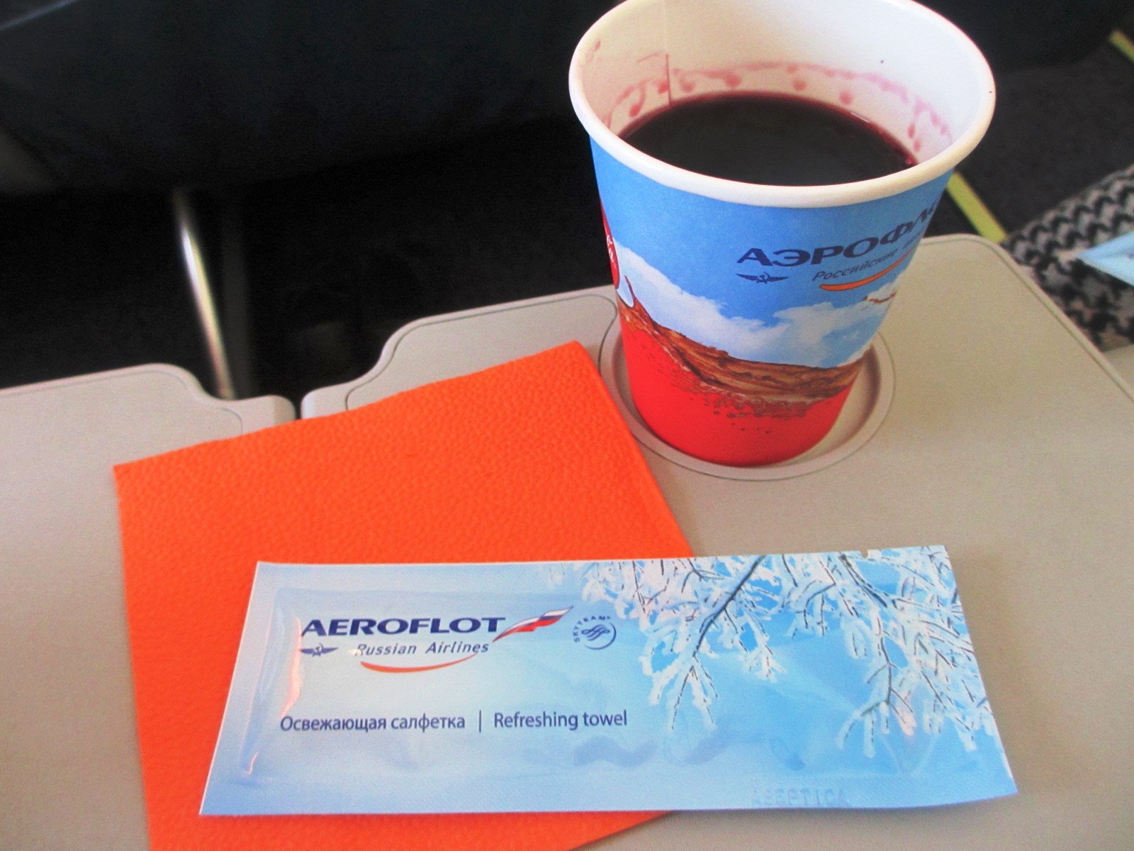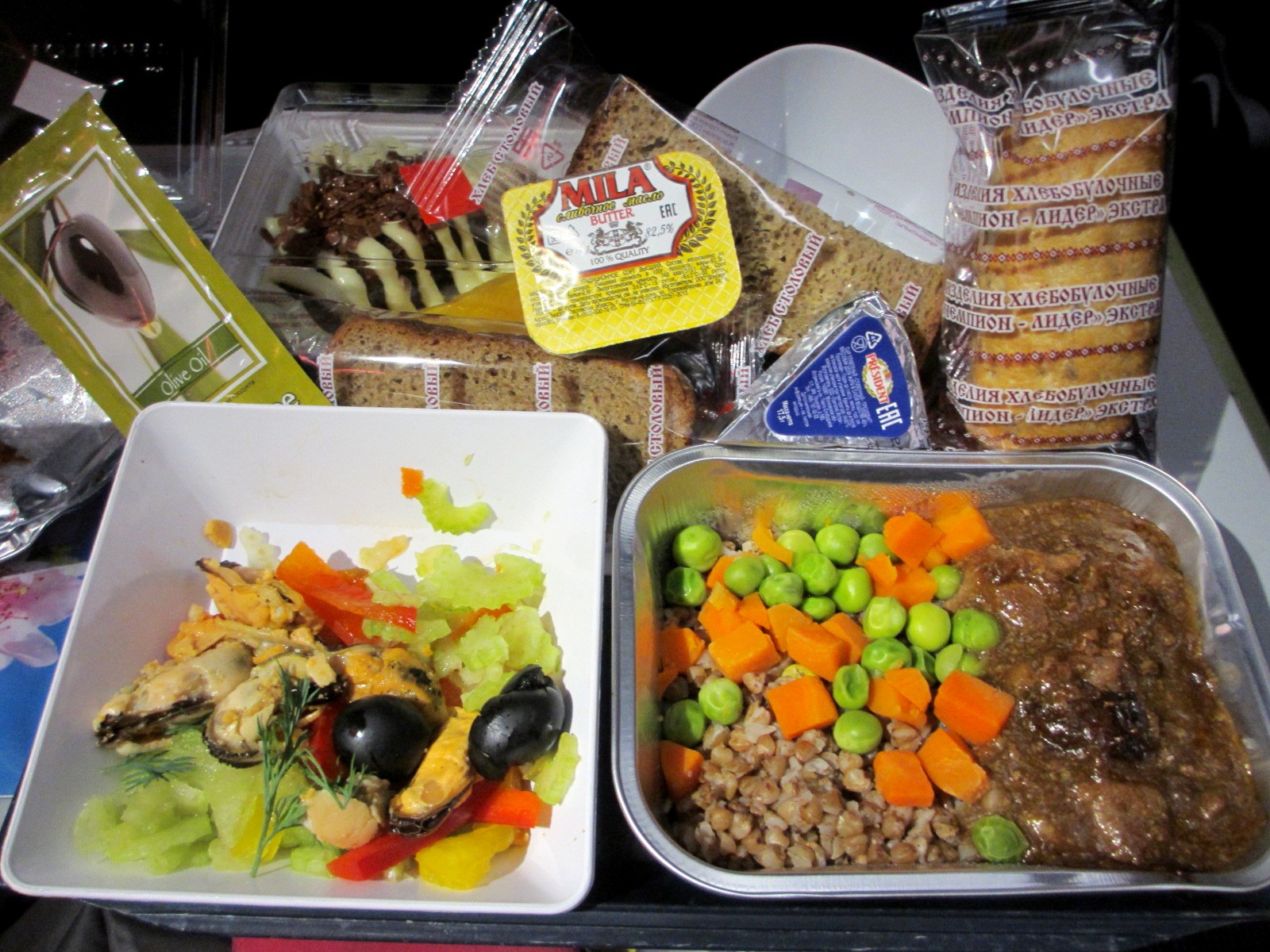 雪から雨に変わったモスクワのセレメティーボ空港を離れ、いよいよ目的地へ。ほぼ予定通りの夜の7:30頃に飛び立ち、ドリンクサービスの後は、いよいよディナーです!