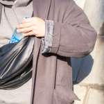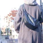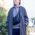 ▲前に抱えることで素早く荷物を出し入れ可能。コートのシルエットを崩さず荷物を携行できます