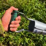 種や球根を穴に入れたら、器材の手元にあるレバーを親指で押せば、逆円錐部分が開き、中の土を元の場所に戻せます。