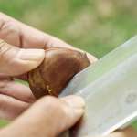 ▲水に浸けておいた栗の鬼皮に切り込みをいれる。こうしないと熱で弾ける