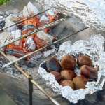 ▲栗は包まなくてOK。網がなかったのでアルミホイルに載せてゴトクに置いたり、熾きの脇に寄せたり…