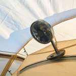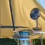 ポイントとしては、テントの頂点に向けてファンを回すだけ。テントサイズにもよりますが、大型テントに比べて弱い風量でも十分空気の循環を感じました。