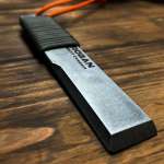 全長165mm、幅27mm、厚み4mm。素材は炭素鋼材。特に特殊な鋼材ではなさそうです。重さは約114g。サイズ、重さとも9cmブレードのナイフと同程度だと思います。先端と片側がベベル状の加工がされていますが刃は付いていません。