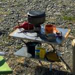 焚き火台のそばではグローブやライターなんかを下のラックに置けるので、いちいち熱い鍋を載せるために小物を片付ける必要はありません。