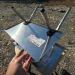 「焚き火テーブル」の組み立ては、ストッパーを開いて脚フレームを取り出し、広げた脚フレームを天板裏のフチに当て、ストッパーを閉じるだけ。簡単です。