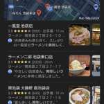 ちなみにSiriに尋ねてみると、一瞬でマップアプリを開いて現在地周辺のラーメン屋をリストアップ。食べログ評価の高い店を推してきます。これは急いで店探しをしたい時には便利。