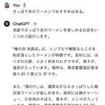 一方で、今回の3つの検証では良さが伝わらないかもしれませんが、AIチャットは「ちょっとした検索では調べにくいことを、深く調べて回答してくれる」能力に優れます。例えばラーメン屋さんの情報で、ここから「さっぱり系の味でおすすめはある?」のようなに無茶振りも出来る点が、AIに尋ねる面白さ。ただし、ハレーション(幻覚、嘘情報)の可能性もありますが。