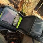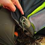 外側の主な収納部は2箇所。上部の小さな部分と、下部の大きな部分。下部は縦開きの仕様。この部分はかなり便利。獲物を獲った後は解体する際にビニール手袋をします。他にも解体した肉のドリップや血液を吸う為のシート(ペットシートを利用)だったり、その肉を収納するビニール袋などを入れたりするのに便利で、充分な収納力とアクセスの良さがポイントです。収納部を含めるポケットの数は計8箇所あり、対象用途に合わせたフレキシブルな設計です。