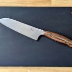 ▲「三徳包丁」全長315mm、刃渡り180mm、重さ約180g。他にも「牛刀」「ペティナイフ」「パン切り包丁」などをラインナップ