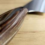 天然木にコーティングを施したハンドルは、美しいカーブを描いていて手にスッと馴染みます。ハンドル部分の長さもちょうど良く手に収まるサイズ感。刃体との境目もキレイに処理されているので、刃とハンドルがひとつの塊のよう。積層模様もたまりません。こういうところの処理からも、質の良さや丁寧な仕事が伝わってきます。