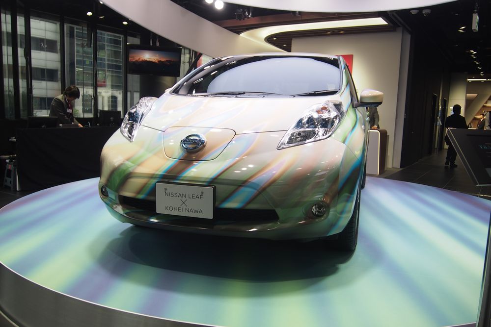 2階にも気になるコンセプトカーを発見! 電気自動車「リーフ」に、クリイエイターの名和晃平さんのアートがほどこされた市販ではなかなか出会えないデザインの車も展示してあります。