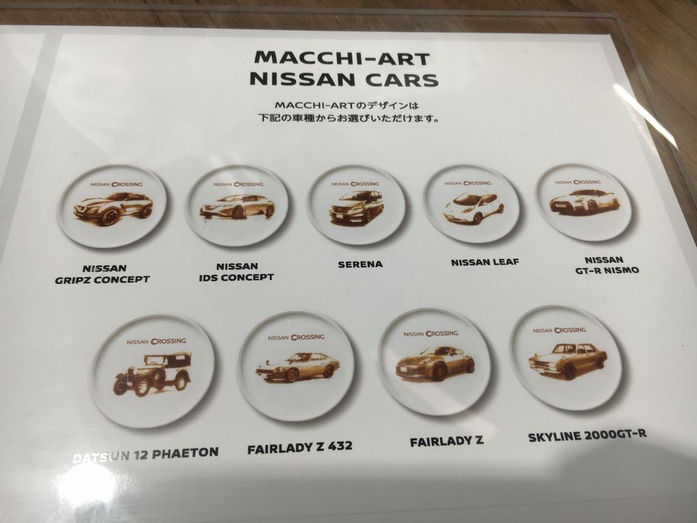 日産の歴史を彩ってきた名車9車種から選び、ラテアートで蘇らせてくれます。「DATSUN 12 PHAETON」などのクラシックカーから、人気車種の日産リーフにセレナ、最新のコンセプトカーまでそろうなかでも、取材時の一番人気は「SKYLINE 2000GT-R」でした。
