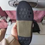 裏側にはシリコンの滑り止めが付いています。床がツルツルの場所でも安心ですね。といっても、クッション性があるわけではないので、外履きには向いてないかな。ルームソックスだから当然といえば当然なのですが。自宅やテント内、山小屋、旅先のホテル、そして今回のような飛行機内が想定使用シーンだと思われます。