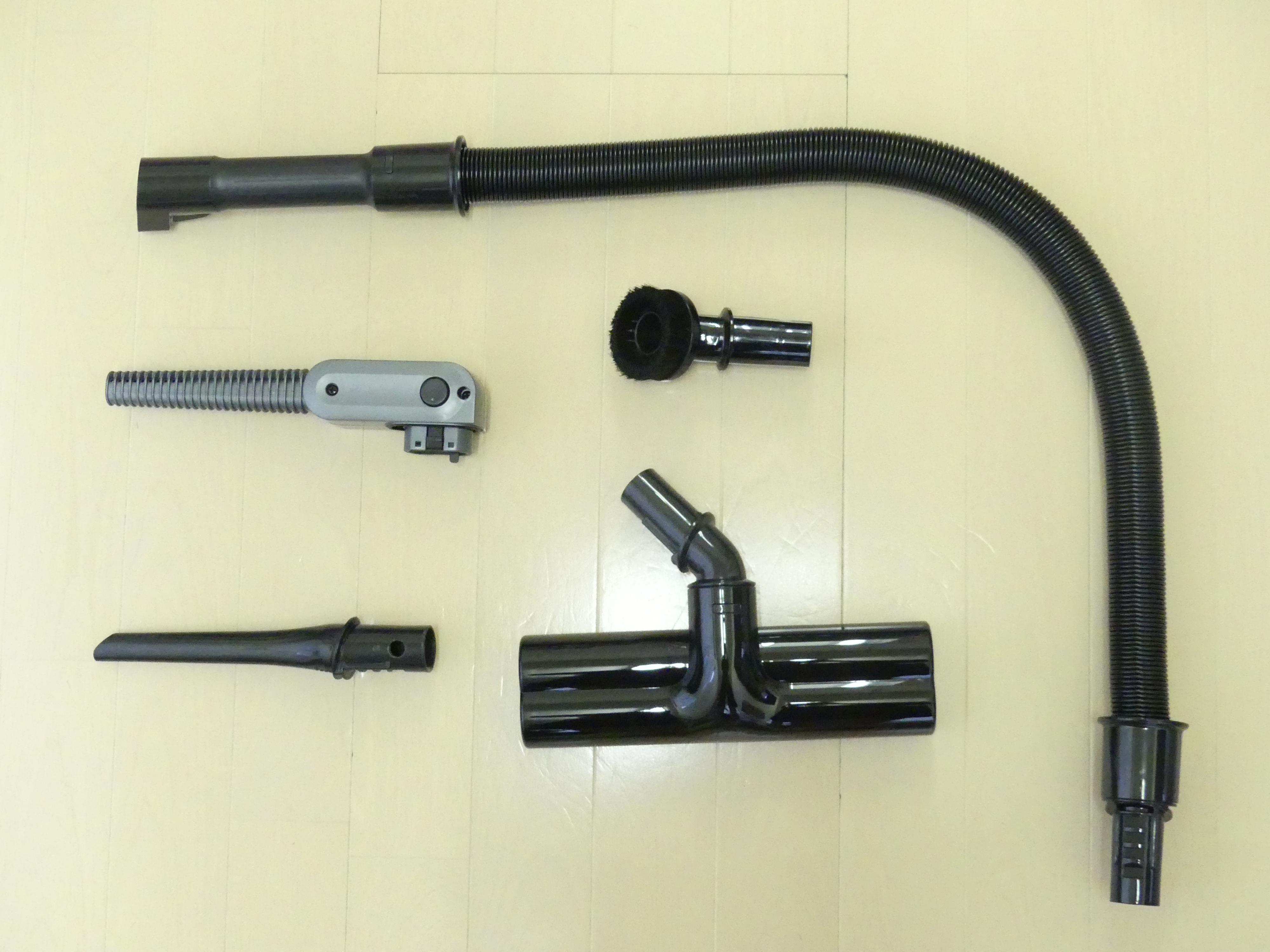 アタッチメントは5つ。付属品用ホース、すき間ノズル、丸ブラシ、ふとん用ブラシ、エアブローノズルが付属している。場所に応じて使い分けたい